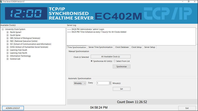 EC402M is an Intelligent Server Application Software that performs time synchronisation with slave clocks, clock hierarchy management, instant time control, clock monitoring. Server Application Software EC402M is installed in the Time Server - Personal Computer.