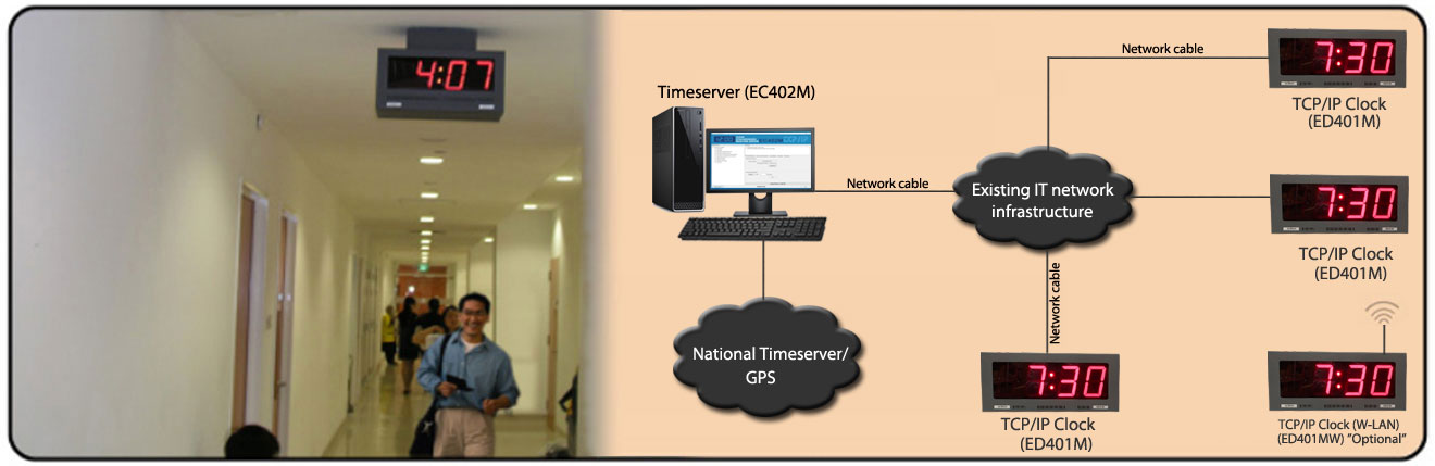 The TCP/IP Synchronised Real Time Clock System ED401M / EC402M is the most ideal system as a Centralised Clock System. A host computer on the network with Server Application Software EC402 is designated as the Time Server (Master clock). It periodically updates the time and the date on all of the slave clocks (ED401M) installed in the network. The Time Server EC402M is synchronised with the National Standard Time Server or GPS.